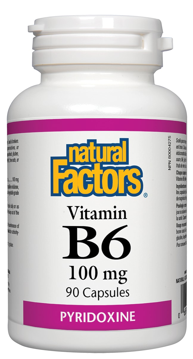 Natural Factors Vitamin B6 capsules offer 100 mg per capsule and help with the metabolism of fats, proteins, and carbohydrates and are a factor in the maintenance of overall good health. Ideal for women of child-bearing age, this vitamin helps manage hormonal symptoms.