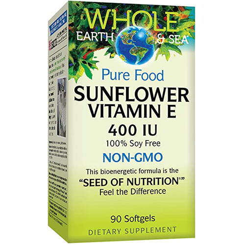 Whole Earth & Sea Pure Food Sunflower Vitamin E contains Naturall-E vitamin E in the ideal, natural d-alpha tocopherol form. Derived from non-GMO sunflower seed oil, the formula is 100% soy-free and ideal for anyone looking to avoid soy-based vitamin E supplements.
